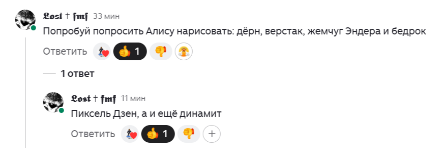 Всем привет! Я уже говорил, что буду делать продолжения своих старых статей со старого канала на этом новом канале. Вот предыдущая часть статьи. Сегодня мне прислали комментарии: Вот ссылка на автора комментария: Ну что же, давайте делать текстур паки по просьбам. В конце статьи я ещё добавлю что-то от себя. Дёрн Дёрн, или блок травы, выглядит так: Думаю, у Алисы можно спросить куб из земли и траву на нём. Давайте проверим, что случится. Но Алиса решила всё перевернуть. Я попросил её нарисовать траву на кубе, а она нарисовала куб на траве. Давайте попробуем перегенерировать изображение и дать Алисе вторую попытку. Но Алиса отказалась меня понимать и сделала так, как в прошлый раз. Я дам Алисе третью попытку, но попрошу её нарисовать сразу четыре варианта. Все варианты были неправильными. Или не все? Посмотрите на третий вариант: всё так, как должно быть. С дёрном Алиса справилась. Теперь можно сделать вывод. Если долго не получается ожидаемый результат, просто попросите Алису