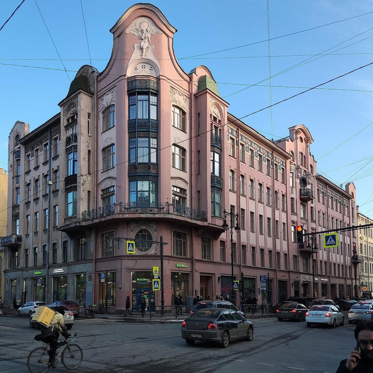 Доходный дом Бадаевых 🟡 Здание начали строить для владельца участка П. Т. Бадаева по проекту гражданского инженера Василия Косякова в 1906 году. 🟡 В 1907 году вдова владельца участка А. В. Бадаева и архитектор получили серебряную медаль на городском конкурсе фасадов. 🟡 У здания пять этажей и два внутренних двора, оно занимает Г-образный участок. Срезанный угловой участок акцентирован эркерами, волнообразным завершением-щипцом, широкими окнами и рельефами. 🟡 Фигура на щипце прозвана «печальным ангелом», по вероятной трактовке это образ Авроры с зодиакальным кругом. 🟡 В декоре здания присутствуют розы, ветки, маки, ирисы, филины на кронштейнах колонн и полевые цветы. 🟡 Вестибюли парадных лестниц украшены керамическими панно, на камине угловой парадной — всадница в плаще на белом коне в лесу. 📍 ул. Жуковского, 53