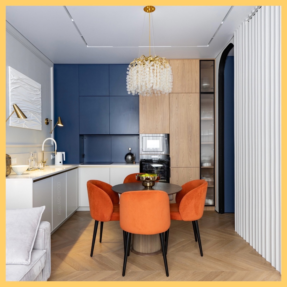 - Синяя кухня, повторяющая оттенок акцентной стены над диваном.