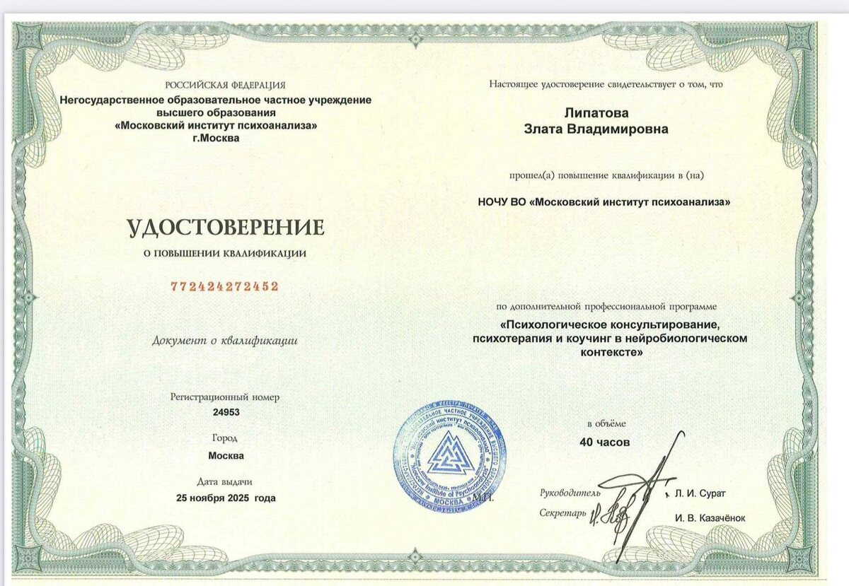 Я тут еще не хвасталась)) Получила квалификацию по нейробиологии в психологическом консультировании в Московском институте Психоанализа Очень круто дали материал по тому, как работает и меняется мозг при обучении, привычках, стрессе, депрессии, терапии и что делать, чтобы эффективнее с этим работать. ✨