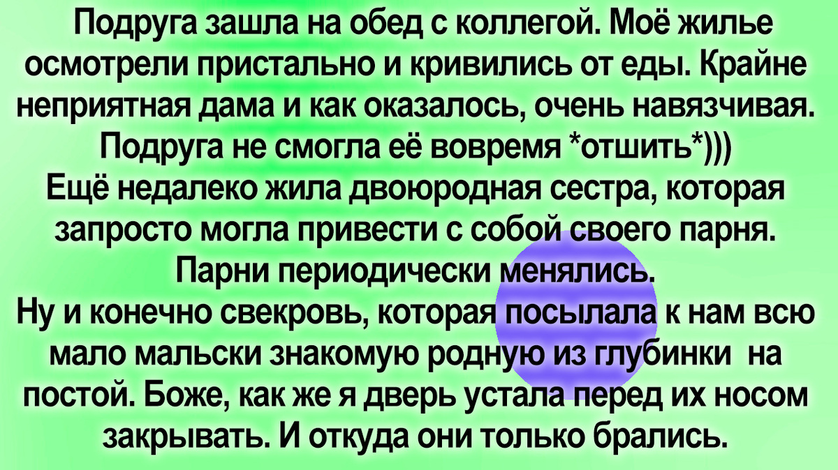Вдруг свекровушка вспомнила, что он когда-то проживал со мной и позвонив мне заявила, что его младшей сестре негде работать в деревне и она хочет переехать в город с тремя детьми и пьяницей мужем. И остановится "на время" у меня, пока не найдёт работу и квартиру. Как будто её кто-то тут ждал.