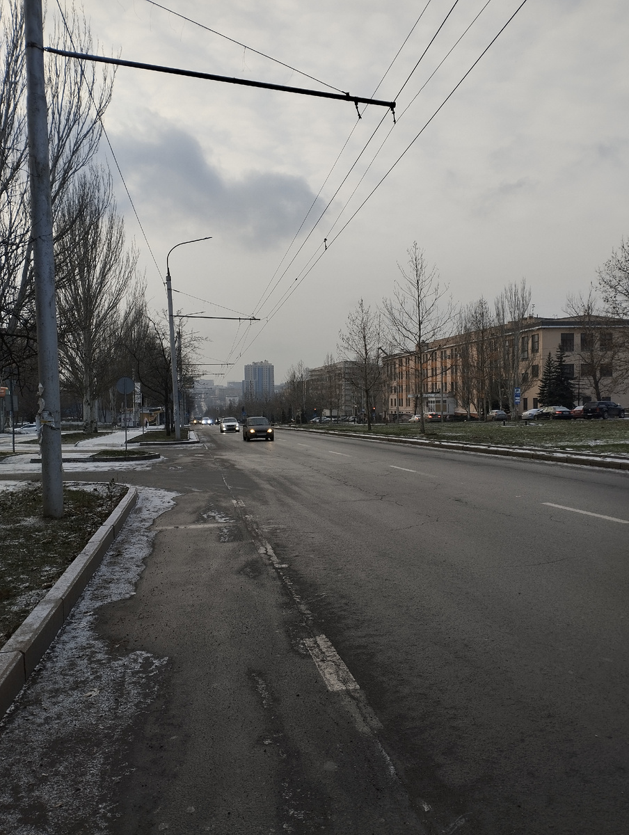 Ну, всё-таки случилось! 15 декабря у нас в Донецке выпал первый снег, а ещё совсем недавно на улицах продолжали цвести розы: Сдались они только неожиданному десятиградусному морозу. А сегодня у меня был план. Нужно было купить подарок. Да, один-единственный, так как больше у меня в Донецке нет родственников и друзей. Значит, нет необходимости особо готовиться к Новому году... Короче, отправляюсь я сегодня в торговый центр, где кое-что приглянулось ранее. Неожиданно выяснилось, что брать нужно было сразу. Сейчас уже нет такого выбора. Ну, ладно. Не проблема. Есть другой гипермаркет: И, конечно, есть возможность заказать на маркетплейсе. А коль так, то стоит просто пройтись и сделать несколько обещанных фото. Снега совсем мало. Лучше всего можно рассмотреть его на газонах, где замёрзла зелёная трава и опавшие листья так и остались неубранные. На тротуарной плитке остались следы кроссовок. У торгового центра уже стоит большая очень скромная ёлка. Небольшой магазин ещё скромнее у