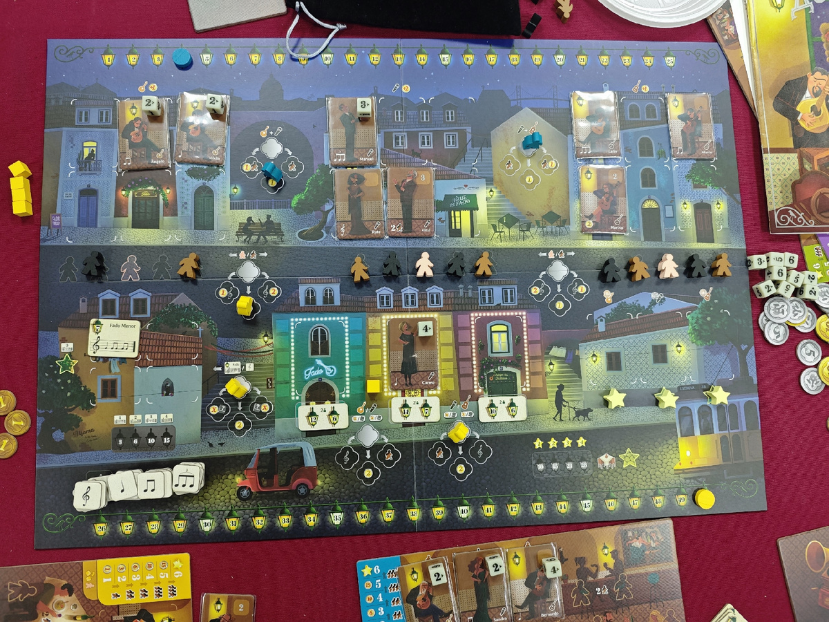 И последней игрой на игротеке стала Дом Фаду от великого и ужасного Витала Ласерды. Правда, в этот раз он решил пощадить своих фанатов и сделал игру довольно лайтовую. В Дом Фаду игроки нанимают уличных музыкантов в свой ресторан. Каждый музыкант имеет известность 1 по умолчанию, но впоследствии она будет увеличиваться. Для этого необходимо привлекать посетителей разных цветов. Они будут аплодировать, а известность музыкантов будет расти. Также игроки будут исполнять различные мелодии. Для этого нужно собирать определенные наборы нот. Эти ноты дают сами музыканты, но также можно собрать их, встав на определенную ячейку на поле. В плане геймплея все просто: берете мипла из своего запаса, выставляете на поле, делаете действие. Когда все миплы будут на поле, они будут просто перемещаться между ячейками. Если чей-то мипл уже стоит на ячейке, вы можете туда встать, но другой игрок получит бонус. Под каждым основным действием есть три бонусные ячейки с разными бонусами, и игрок, которого "