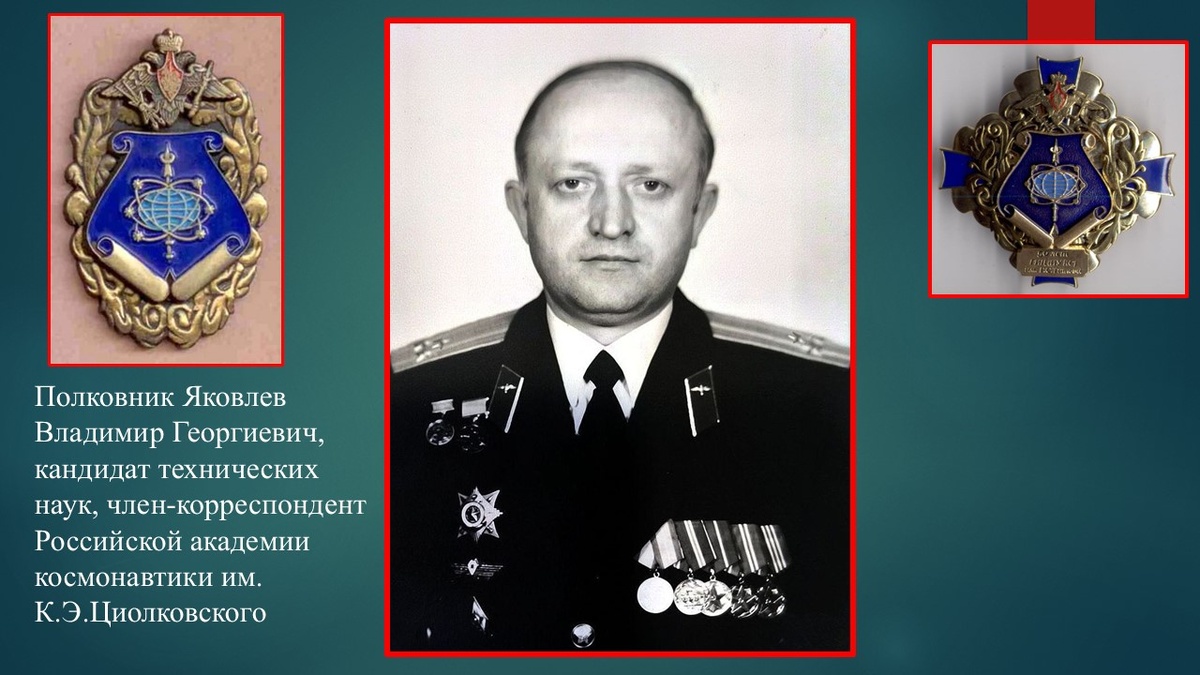 Полковник Яковлев Владимир Георгиевич, кандидат технических наук, член-корреспондент Российской академии космонавтики им. К.Э.Циолковского (1998г.), заместитель начальника ГИЦИУ КС по вооружению - начальник службы вооружения (1991-1998гг.). В Вооруженных Силах СССР и РФ с 1968 по 1998 год.