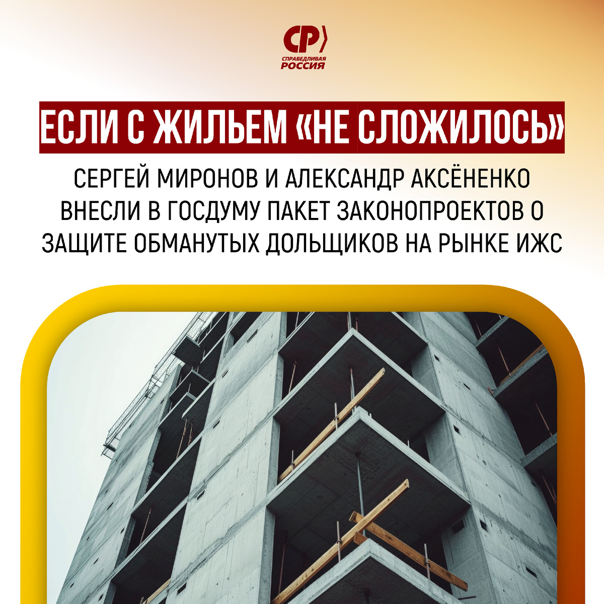 Руководитель фракции СР Сергей Миронов и депутат ГД Александр Аксëненко внесли в Госдуму пакет законопроектов о поддержке жертв мошенников на рынке индивидуального жилищного строительства (ИЖС). Сергей Миронов рассказал, что, по оценкам Минстроя, только за 2023–2024 годы при строительстве своих домов от рук мошенников пострадали почти 11 тысяч человек. Банки выдавали людям кредиты на ИЖС, указывая подрядчиков, у которых они должны строиться. А подрядчики оказывались мошенниками и ничего не строили. Многие заёмщики до сих пор выплачивают ипотеку за несуществующее жильё, даже когда факты мошенничества подтверждены. Законопроекты СР предлагают: – Запретить банкам повышать ставку льготной ипотеки, требовать досрочного возврата кредита и в целом лишать граждан льготного кредитования из‑за задержки сроков строительства и регистрации права собственности; – Ввести для обманутых дольщиков «ипотечные каникулы» и распространить этот механизм на договоры, заключённые с 1 января 2020 года. (т. е.