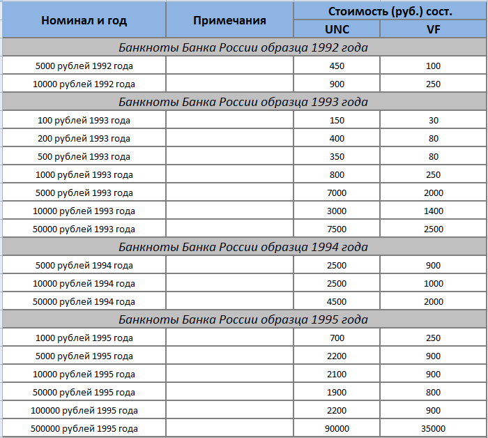 Давно я уже не обновлял табличку с ценами на купюры России "90-х". Под этими купюрами я подразумеваю те, которые относятся к образцам 1992, 1993 (плюс модификация 1994) и 1995 годов. Купюры образца 1997 лучше рассматривать отдельно, так как мы ими до сих пор пользуемся (модификациями этих купюр). Там много модификаций и вариантов. Табличка с ценами на купюры России 90-х очень простая, сразу её продемонстрирую: Особенности: По данным ценам прямо сейчас можно найти купюры в продаже на различных ресурсах для коллекционеров (из реальных лотов я и взял цены). Цены в основном минимальные или средние. Все цены указаны за самую распространенную разновидность (например, по серии). Некоторые варианты могут стоить значительно дороже. Ориентироваться лучше на столбик UNC (когда сохранность идеальная), сохранность VF чисто условная, так как под этой степенью сохранности обычно понимают очень большой предел, основанный на собственном видении состояния. *** Сам я собираю купюры России, но пока