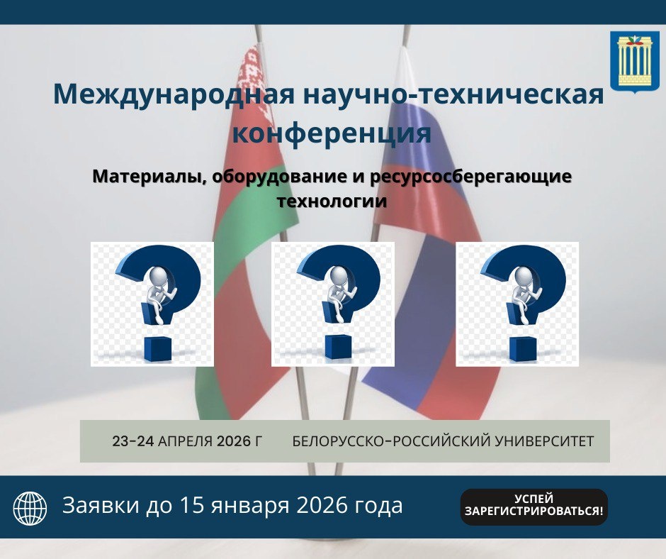 Успейте заявить о своем исследовании! 📣 Белорусско-Российский университет объявляет о старте приема заявок на Международную научно-техническую конференцию «Материалы, оборудование и ресурсосберегающие технологии». 📆 Когда крнференция: 23–24 апреля 2026 г. 📍 Где: БРУ 🌐 Языки: русский, белорусский, английский. ⏰ Дедлайн подачи заявок: до 15 января 2026 г. Основные направления (секции): ⚙️ Машиностроение, робототехника и мехатроника. 🔬 Новые материалы, покрытия и сварка. 🏗️ Строительство и техносферная безопасность. ⌨️ IT, интеллектуальные системы и математическое моделирование. 📈 Экономика и логистика в цифровую эпоху. 🤝 Гуманитарные аспекты в технических вузах. ❔ Что нужно для участия? ➡️ Прислать тезисы и заявку на 📧 onti336-341@yandex.ru. ➡️ Направить почтой печатный вариант тезисов и экспертное заключение. 🔗 Подробные требования и условия участия на сайте. 🖥 Подписывайся на наши соцсети: 💬 VK / 📹YouTube / 📺RuTube / 📱 Instagram / 📱 TikTok