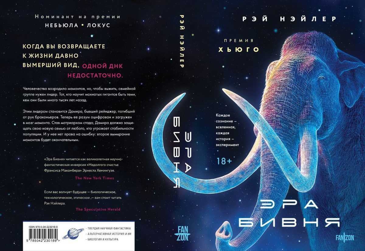 В начале года издаем книгу Рэя Нэйлера «Эра бивня»! Это сборник научно-фантастических рассказов и повестей от автора «Горы в море», получившей литературную премию в области научной фантастики. Для тех, кому нравятся произведения Уильяма Гибсона, Питера Уоттса, Станислава Лема, Яцека Дукая, Паоло Бачигалупи и одновременно лиричность Рэя Брэдбери и Урсулы Ле Гуин. Нас ждут интеллектуальная научная фантастика, эко-триллер о возрождении мамонтов, альтернативная история, ИИ и нейронауки, инопланетные существа и загадки сознания. Заглавное произведение расскажет нам об эксперименте по возвращению к жизни мамонтов. Но только воссоздания этих существ этого недостаточно — теперь кто-то должен повести это стадо. Тогда сознание погибшего рейнджера Дамиры оцифровывают и загружают в мозг мамонта. Ей нужно будет защитить свою новую семью — ведь второе вымирание мамонтов будет последним... «"Эра Бивня" — это трогательная дань красоте существ, которых мы слишком часто принимаем как должное; размы