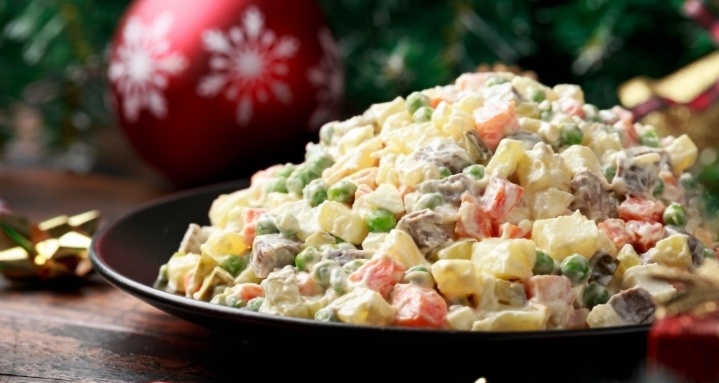 1. **Оливье** **Ингредиенты:** - 3-4 картофелины - 2-3 моркови - 3 яйца - 1 банка горошка - 300 г варёной колбасы или куриного филе - Огурцы солёные (по вкусу) - Майонез - Соль, перец **Приготовление:** 1. Отварите картошку, морковь и яйца. Остудите и нарежьте кубиками. 2. В глубокой миске смешайте все ингредиенты: нарезанные овощи, яйца, колбасу и горошек. 3. Заправьте майонезом, посолите и поперчите по вкусу. Хорошо перемешайте. 2. **Запечённый лосось с лимоном и укропом** **Ингредиенты:** - 600 г филе лосося - 1 лимон - Укроп свежий - Оливковое масло - Соль, перец **Приготовление:** 1. Разогрейте духовку до 200°C. 2. На противень положите филе рыбы, полейте оливковым маслом и приправьте солью и перцем. 3. Сверху выложите ломтики лимона и посыпьте укропом. 4. Запекайте около 20-25 минут, пока рыба не станет нежной и раскрошенной. 3. **Бефстроганов из говядины** **Ингредиенты:** - 500 г говядины - 1 большая луковица - 200 г шампиньонов - 200 мл сметаны - Мука, соль, пе