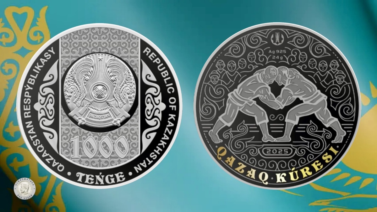 17 декабря 2025 года Национальный Банк Казахстана выпускает в обращение коллекционные монеты QAZAQ KÚRESI из серии монет «Обряды, национальные игры Казахстана». Подписывайтесь на канал Нумизматика как хобби, чтобы не пропустить что-нибудь интересное! О коллекционных монетах «Қазақ күресі» — это традиционная казахская национальная борьба, в которой два соперника меряются силой, ловкостью и выносливостью. Этот вид единоборств имеет многовековую историю и считается важной частью казахской культуры и спортивного наследия. Монеты изготовлены: - из серебра 925 пробы с золочением, массой 24 грамма, диаметром 37 мм, качеством изготовления proof, номиналом 1000 тенге, тиражом 2 000 (две тысячи) штук; Изображение монеты из серебра 1 000 тенге 2025 года «QAZAQ KÚRESI». Источник: nationalbank.kz - сплава мельхиор (МН 25), массой 15 грамм, диаметром 33 мм, качеством изготовления brilliant uncirculated, номиналом 200 тенге, тиражом 5 000 (пять тысяч) штук; Изображение монеты из мельхиора 200 тенге