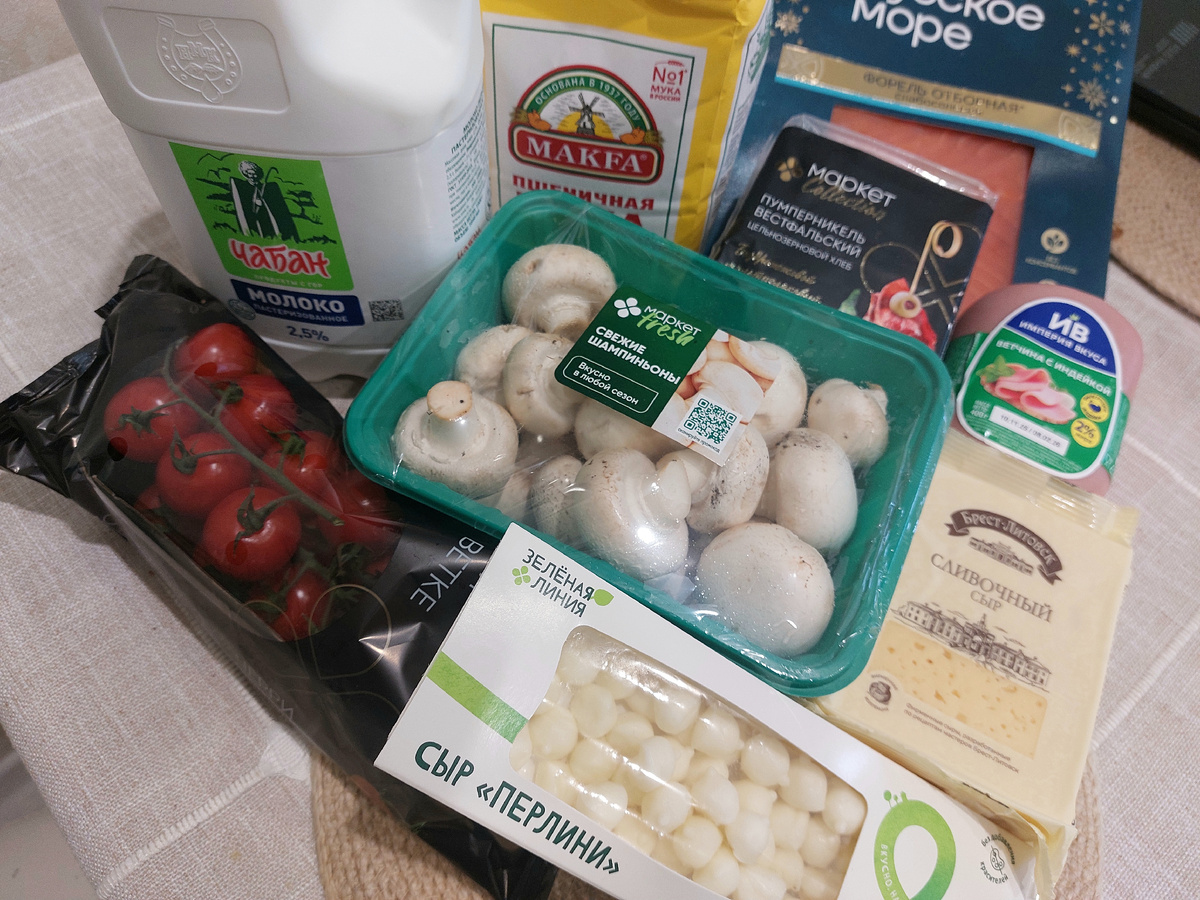 А ведь публикация должна была выйти еще в 8 утра, но тут произошли изменения, и пришлось ее немного задержать. Когда я была в Краснодаре, решили мы с дочкой напечь блинов, а потом их нафаршировать. Лично мне кажется, что такие блины — отличная вещь и на завтрак, и на работу с собой взять, и на перекус. Вдруг подруга в гости зашла в обеденный перерыв, а в морозильной камере всегда есть блинчики, бери и разогревай. Заказали доставку: молоко, грибы, ветчина, сыр — это было необходимо для приготовления блинов с ветчиной, сыром и грибами, а всё остальное куплено по желанию. Я приготовила тесто для блинов по своему любимому и простому рецепту: — добавляю в миску стакан молока, а к нему два яйца, соль, масло растительное (можно сливочное растопленное), пару столовых ложек измельченных овсяных хлопьев, тщательно размешиваю; — добавляю стакан муки, еще раз размешиваю; — добавляю стакан горячей воды, снова размешиваю. Оставляю тесто в покое минут на двадцать. Сахар и соду не добавляю. А затем вы