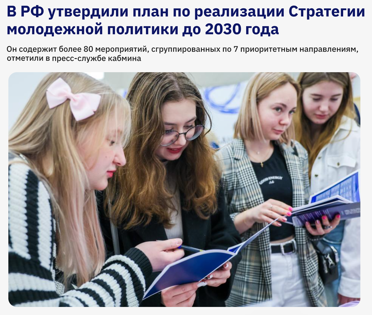 Сегодня в рубрике «Новости» решила сделать акцент на «социальной сфере». К этому моменту на курсах или в школе вы уже подошли к изучению этого блока. Он небольшой по объёму и часто остаётся без должного внимания: в первой части по нему всего два задания – 8 и 9, причём фактически остаётся только восьмое. (согласитесь, задание на диаграммы можно выполнить, вообще не открывая учебник по обществознанию) Экономику мы с вами уже разобрали вдоль и поперёк: бюджетная политика, налоги, денежно-кредитная политика, роль Центрального банка – всего этого у вас было более чем достаточно, а вот в социальной сфере есть важная тема, которую часто недооценивают – «Государственная молодёжная политика». Поэтому сегодня я решила убить двух зайцев: продолжить тему деятельности Правительства РФ и показать, как оно реализует молодёжную политику на практике. Ниже новость и пример того, как её можно использовать в 19 задании 🤝 Правительство утвердило план мероприятий по реализации Стратегии молодёжной поли