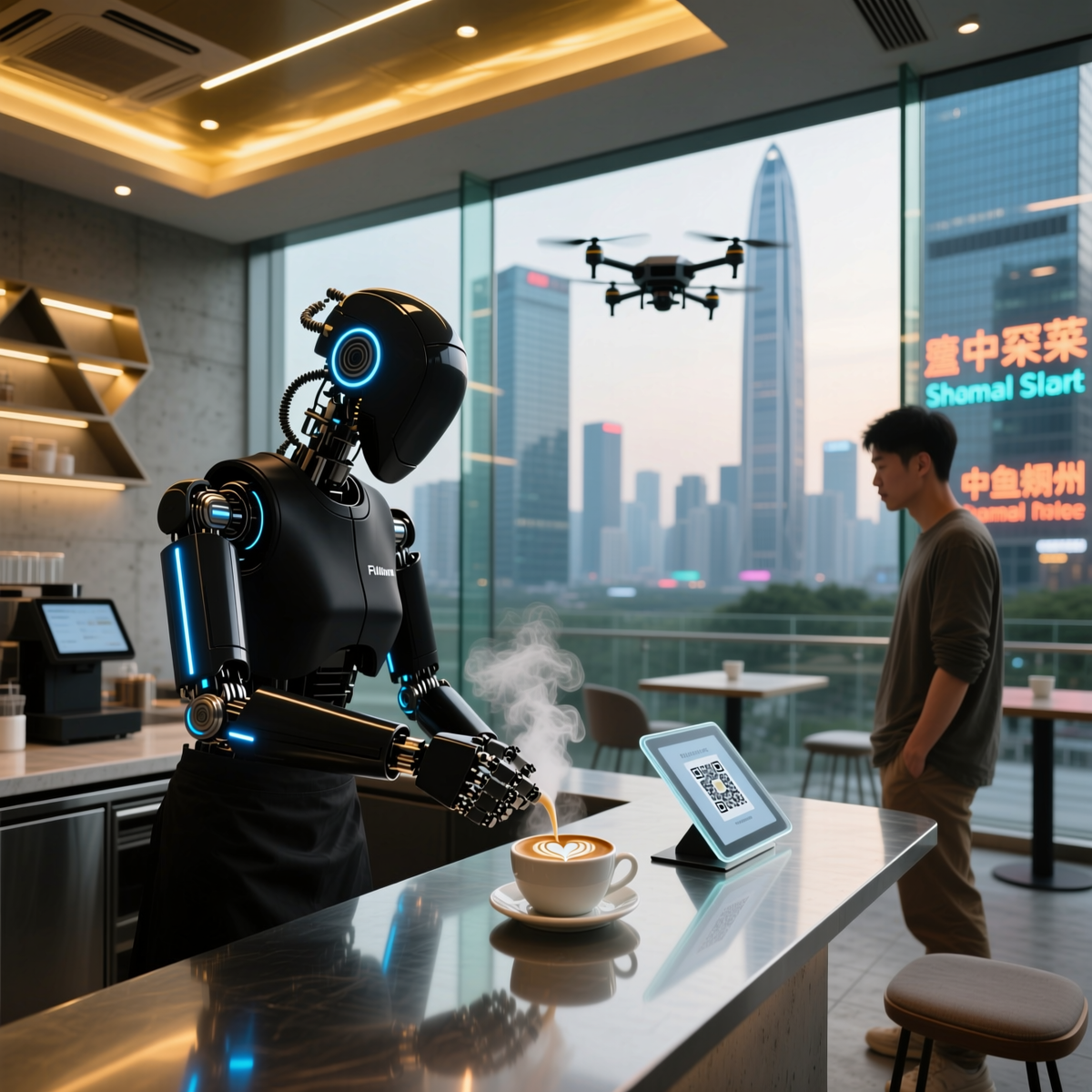 Кофе в Шэньчжэне готовит робот. Он берёт стаканчик, наливает эспрессо, добавляет молоко, закрывает крышкой — и всё это с точностью хирурга. Скан QR-кода, и напиток опускается к вам. Вкус? Превосходный. За капучино в 13 юаней (около $2) вы получаете не просто кофе, а опыт, демонстрирующий, как автоматизация проникает даже в сферы, считающиеся сугубо человеческими.