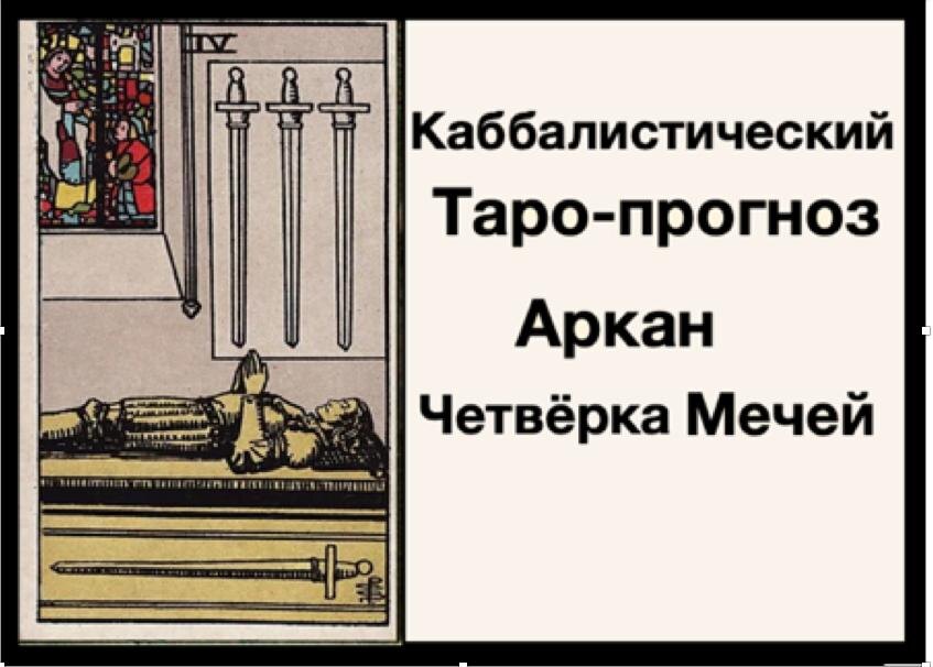 Аркан каббалистической системы Таро: Четвёрка Мечей Прогноз Системы Таро предназначен исключительно для жителей России. Если вы читаете эти строки, значит, Вселенная посылает вам знак — прислушайтесь к нему внимательно. Обратите внимание на проявление энергий Аркана Четвёрка Мечей в вашей жизни и используйте его советы, чтобы избежать негативных ситуаций. Девиз Аркана Четвёрка Мечей: "В тишине находишь силу, в покое — мудрость." Аркан Четвёрка Мечей символизирует отдых, восстановление сил, отказ от борьбы, одиночество, отшельничество, предусмотрительность, сдержанность, осторожность, экономию и гармонию. Высокочастотные вибрации Аркана Четвёрка Мечей даруют способность сопротивляться злым чарам, помогают сохранить здоровье и защищают от ядов, токсичных газов, укусов змей и насекомых, абсцессов, ран и гноящихся повреждений. Они также приносят благословение Богов, духов и людей. Низкочастотные демонические энергии Аркана Четвёрка Мечей могут проявляться как изгнание, заточение, сон аст