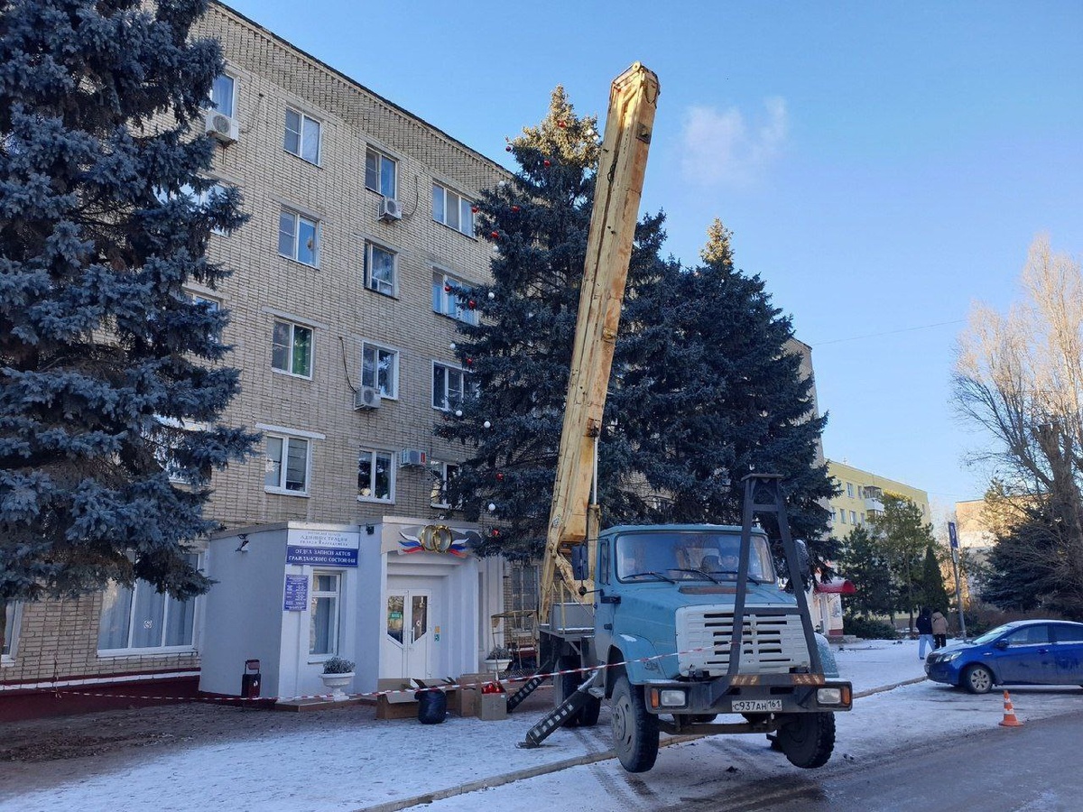 В Волгодонске возле отдела ЗАГСа украшают к Новому году живую ёлку