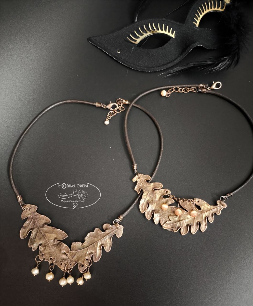 Добрый вечер😍 Мои новые работы. Колье в виде листиков дуба на кожаном шнуре. Украшены бусинами из речного жмчуга. Второе колье украшено бусинами из сердолика. На кожаном шнуре. Элементы колье из меди, гальванопластика, покрыты восковыми патинами. Гипоаллергенны, долгий срок службы изделий. Работы представлены в магазине " Твоя полка", Ставрополь, пр, Октябрьской революции 7 Цена за колье 2300 руб!