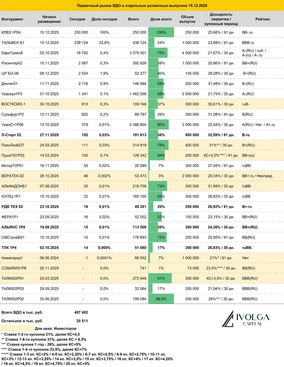 Итоги первичных размещений ВДО и некоторых розничных выпусков на 15 декабря 2025 г.