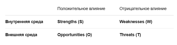 - O (Opportunities) — возможности (внешние благоприятные факторы);