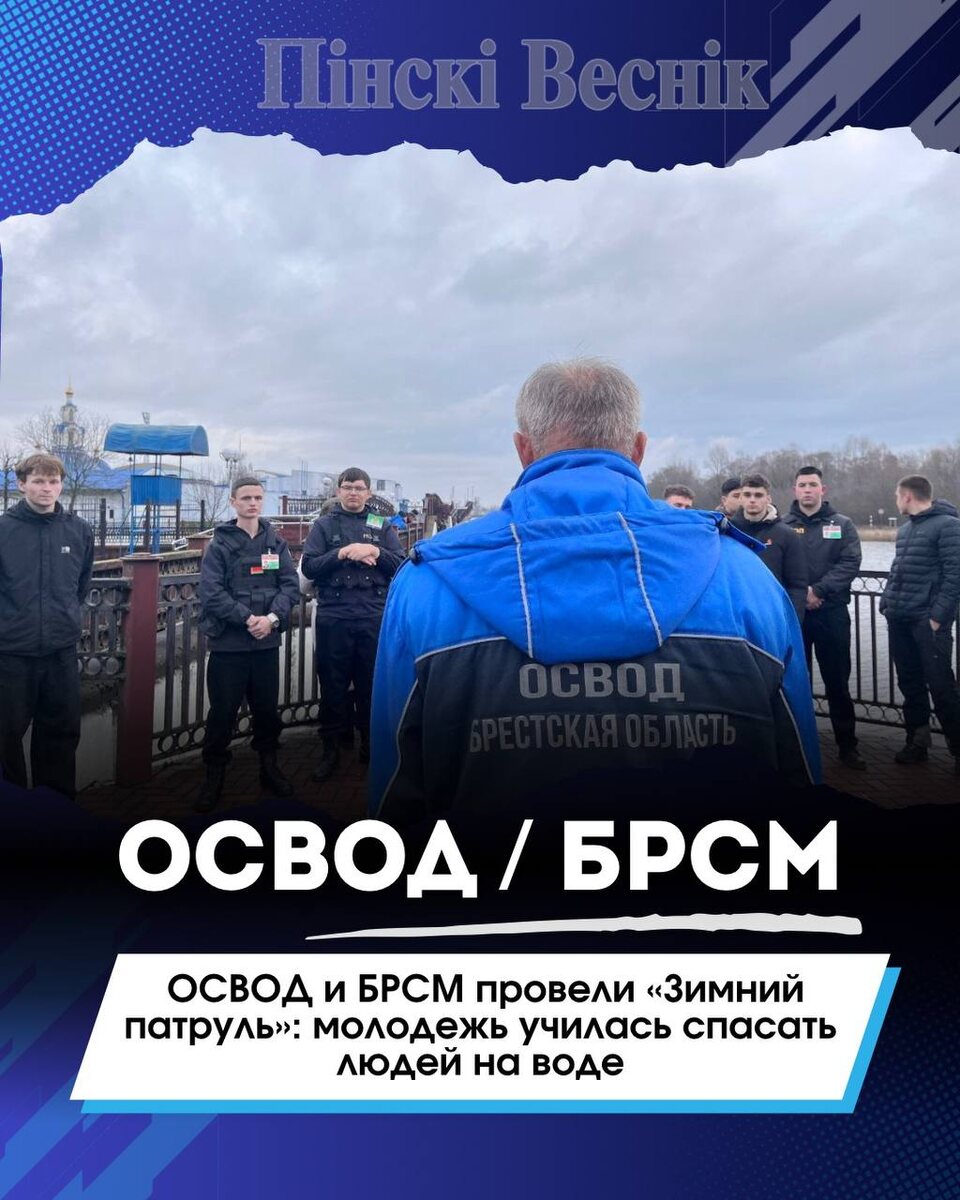 📌ОСВОД и БРСМ провели «Зимний патруль»: молодежь училась спасать людей на воде ⏩В рамках республиканской акции «Зимний патруль» ОСВОД совместно с ГК ОО «БРСМ» провели тренировочное занятие для бойцов молодежных отрядов охраны правопорядка. 🔄Цель — предотвратить ЧС на водоемах и не допустить выхода на тонкий лед. Командир и его заместитель МООП «Алмаз» ПО ОО «БРСМ» #ПГАТККЛЕЩЕВА приняли активное участие. Участники отработали правила безопасного поведения на зимних водоемах, навыки оказания первой помощи и методы информирования людей об опасности выхода на лед. ➡️Берегите себя и близких — не выходите на тонкий лед. @Пинский Вестник 📱Ютуб 📱ВК 📱ИНСТАГРАМ 📱ОК 📱ФЕЙСБУК 📱ТИК ТОК Прислать новость