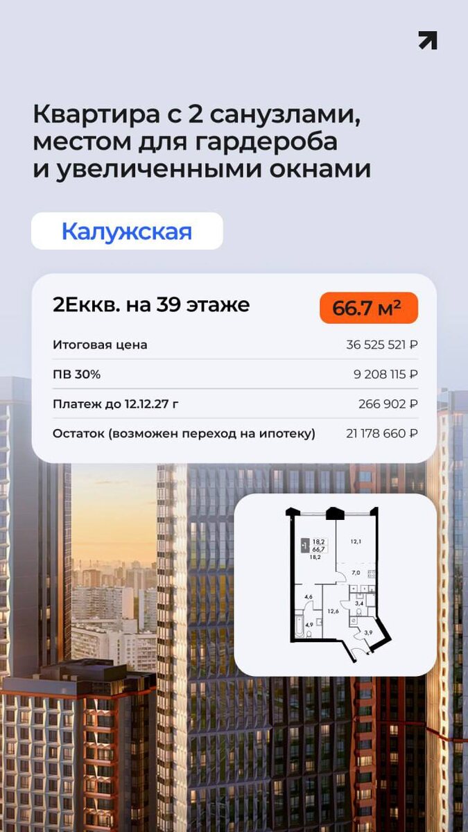 Рассрочка на сданное жилье в ЖК «Архитектор» с возможностью перехода на ипотеку Распространяется на выделенный пул квартир: ⚫️ 2Еккв. 66.7 м² №1233 ⚫️ 2Еккв. 43.4 м² №1177 с лоджией Преимущества проекта: – Система «Умный дом» – Двухуровневый двор от бюро «Утро» – 500 м до лесопарка, рядом несколько крупных зеленых зон – Наличие фитнес-студии в ЖК 📍 Обручевский, ул Академика Волгина 10 минут пешком до метро «Калужская» #фск #рассрочка