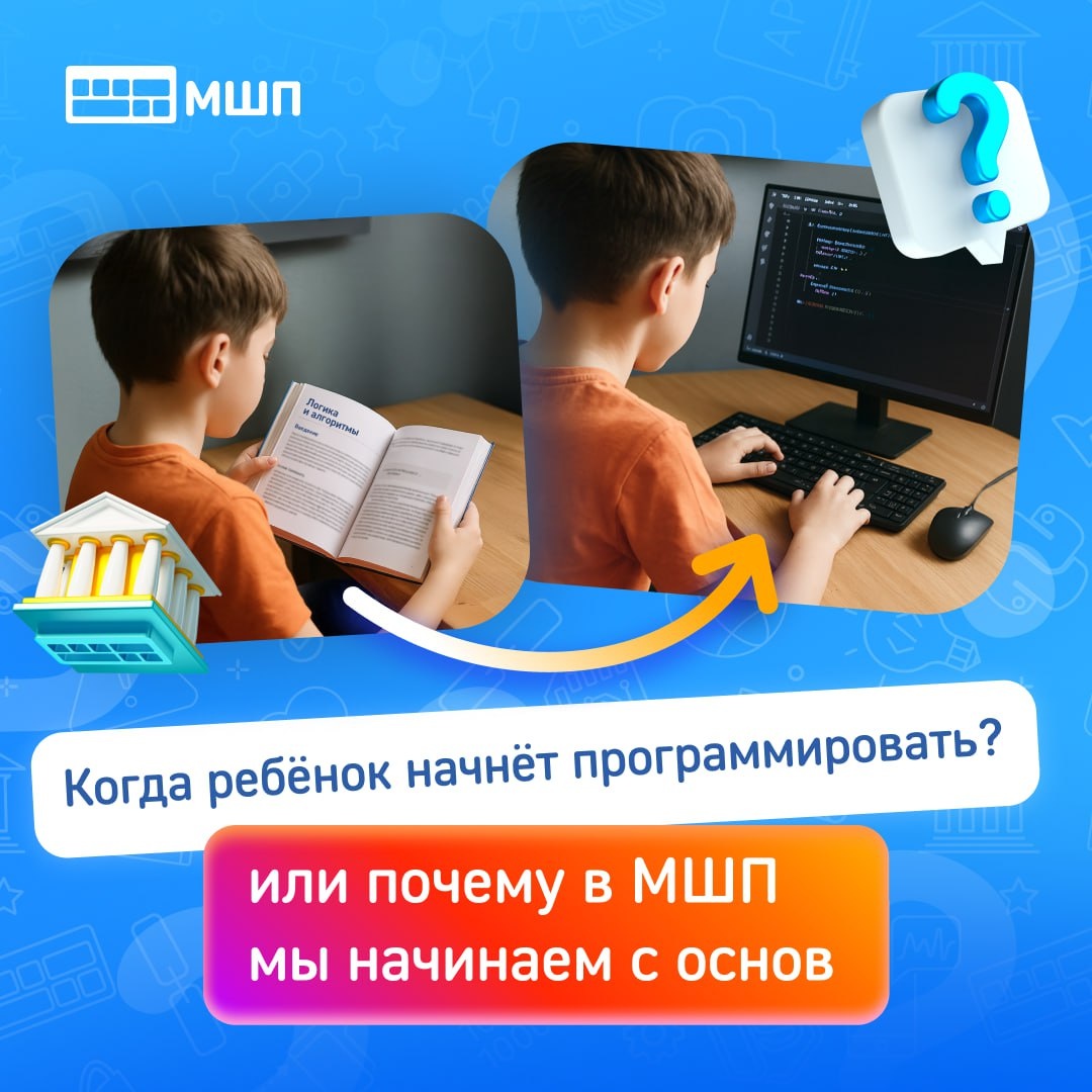 «Когда ребёнок начнёт программировать?», или почему в МШП мы начинаем с основ Это один из самых частых вопросов от родителей. Кажется, что если ребёнок пришёл «учиться программировать», то он должен сразу писать код. 💡 Но в реальности программирование начинается не с синтаксиса, а с мышления. Если дать код без основы, дети просто повторяют команды и быстро теряют мотивацию. Если начать с логики и алгоритмов — ребёнок понимает, что он делает и почему. 🧠 Программирование = мышление, а не только синтаксис Когда ребёнок изучает основы алгоритмов, логику, структуру данных — он осваивает «скелет» программирования. Позже к этому добавится синтаксис, и всё встанет на места. И это не просто педагогика — это подтверждают исследования. ✔️ В исследованиях МГППУ (2023) дети, начинающие с логики и цифровых моделей, быстрее развивают планирование, когнитивную гибкость и умение формулировать мысли — фундамент будущего программиста. ✔️ А в отчёте ОЭСР (Организация экономического сотрудничеств