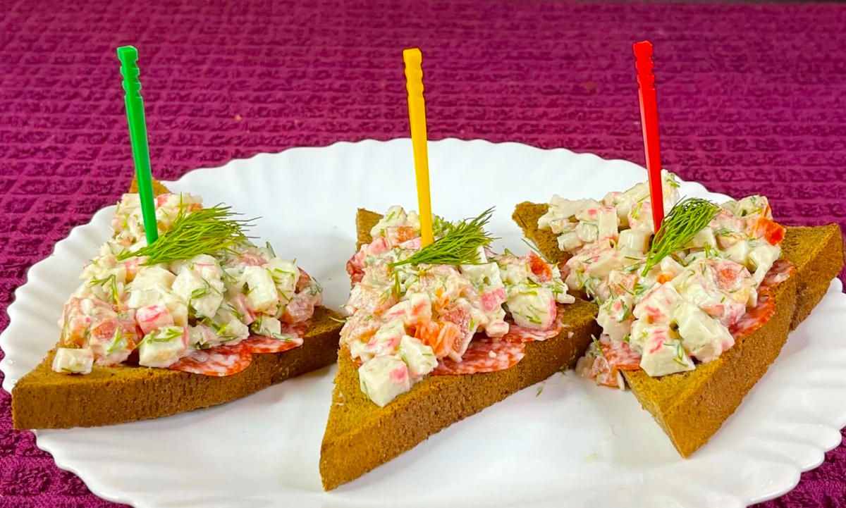 — «А что это было?» Эти бутерброды я готовлю каждый Новый год. Честно скажу: раньше ни у кого таких не встречала. Вроде бы всё знакомое, но вместе получается настолько удачно, что тарелка пустеет за считанные минуты. Почему эта закуска так нравится всем выглядит ярко и празднично готовится быстро, без заморочек сочетает мясо, морепродукты и сыр подходит и к шампанскому, и к горячему А ещё это тот случай, когда вкус богаче, чем ожидаешь. Что понадобится хлеб (батон или тостовый) салями крабовые палочки томаты твёрдый сыр чеснок майонез специи (чёрный перец, паприка — по вкусу) свежая зелень для подачи Количество — произвольное. Я всегда делаю «на глаз» и ещё ни разу не ошиблась. Как я готовлю эти бутерброды Хлеб нарезаю кусочками — удобными, на один укус. На каждый кусочек выкладываю салями. Сверху — мелко нарезанные крабовые палочки. Добавляю ломтики томатов (не