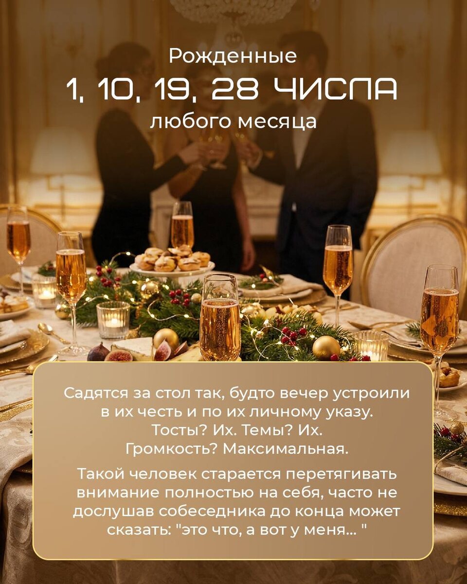 🎄Скоро Новый год, время волшебства, вкусного праздничного застолья и теплого общения с родными и друзьями. Артём Блок @artem_blok1 подготовил увлекательные расшифровки о том, как ведут себя за новогодним столом люди в зависимости от даты рождения! Ведь каждый из нас обладает уникальной энергетикой и особенностями характера. Узнали себя? Своих близких? Друзей?