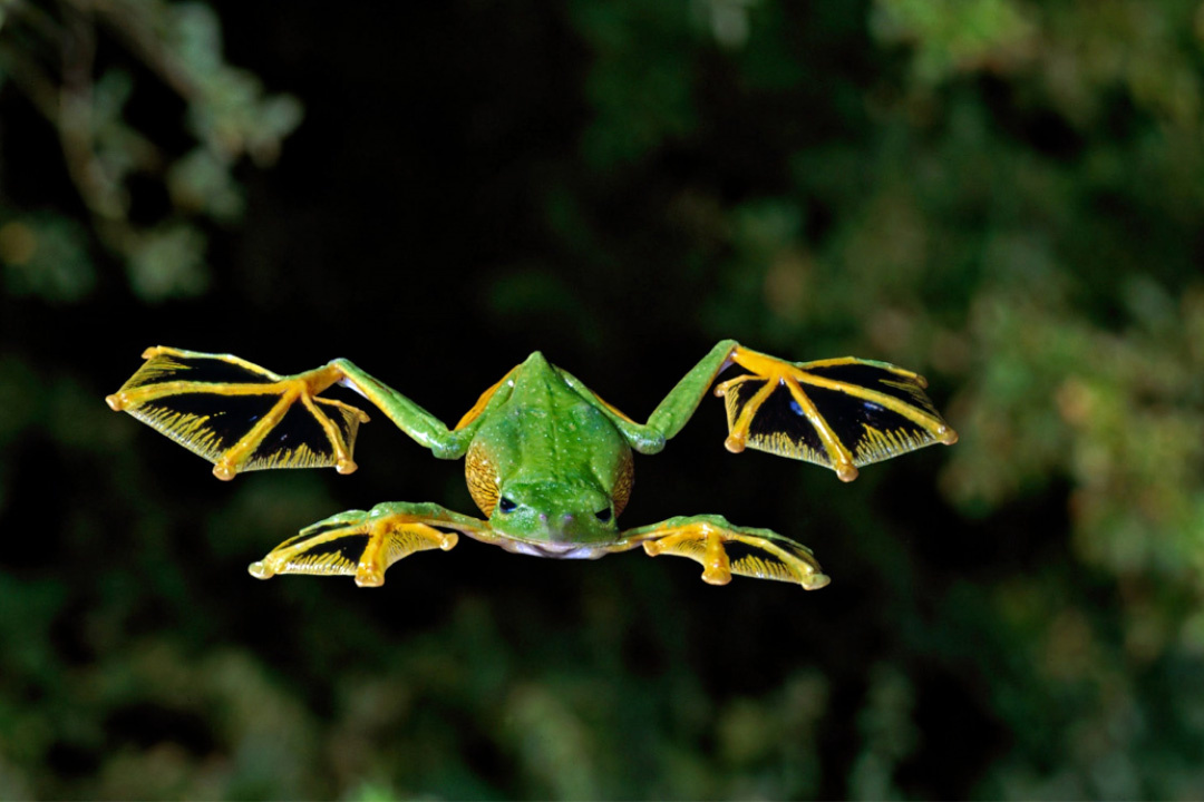 Привет, мои дорогие любители необычной земной фауны, сегодня я хочу показать вам существо, глядя на которое трудно избавиться от ощущения, что дизайнеры научной фантастики когда-то подсматривали не в концепт-арты, а в живую природу. Представьте себе амфибию, которая при прыжке внезапно раскрывается, словно боевой аппарат из «Звёздных войн», и на мгновение превращается в нечто, больше похожее на истребитель, чем на лягушку — признаюсь, у меня в такие моменты в голове сам собой включается имперский марш. Знакомьтесь: лягушка Уолласа, или чернолапый веслоног (Rhacophorus nigropalmatus), существо, чьи лапы действительно выглядят так, будто их проектировали под солнечные панели для космического корабля. Обитает эта лягушка в тропических лесах Юго-Восточной Азии — в Малайзии, Таиланде, а также в Индонезии на островах Суматра и Борнео, где жизнь разворачивается не у земли под ногами, а высоко в кронах деревьев. Внешность у неё запоминающаяся: крупные выразительные глаза и невероятно развитые