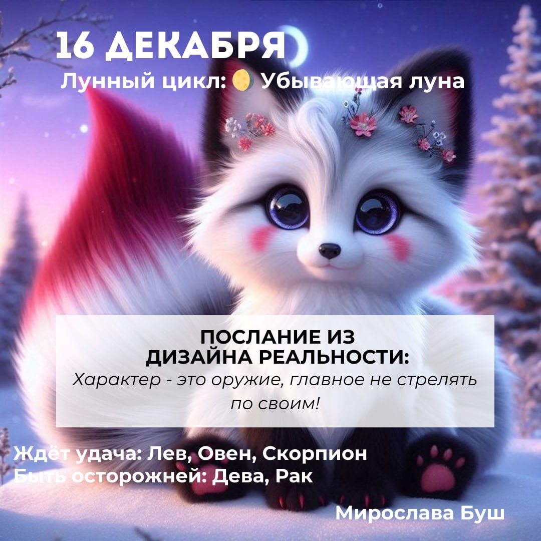 16 декабря РЕКОМЕНДАЦИИ: 🎉 Проведите мини-дуэль с самой собой: например, на скорость выполните задание или придумайте смешной стишок о себе. Да здравствует внутренний комик и бунтарь! 🕺 Танцуйте, как будто никто не смотрит (а возможно, и смотрит — тогда сделайте из этого шоу). Пусть ваше движение станет источником смеха и вдохновения для вас и других людей, а вдруг вы устроите настоящий флешмоб?) 🌟 И не забывайте — жизнь коротка, так что если вдруг захотелось одеть шляпу из макарон или говорить только на языке рыб — делайте это! Чем более нелепо, тем ближе вы к настоящему искусству счастья. ✉ Подписаться на Мирославу