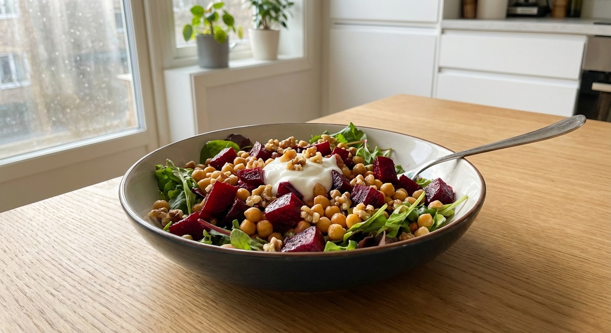 Это тёплое блюдо: свёкла и нут согревают, зелень даёт свежесть, а заправка придаёт тот самый «кафешный» вкус.