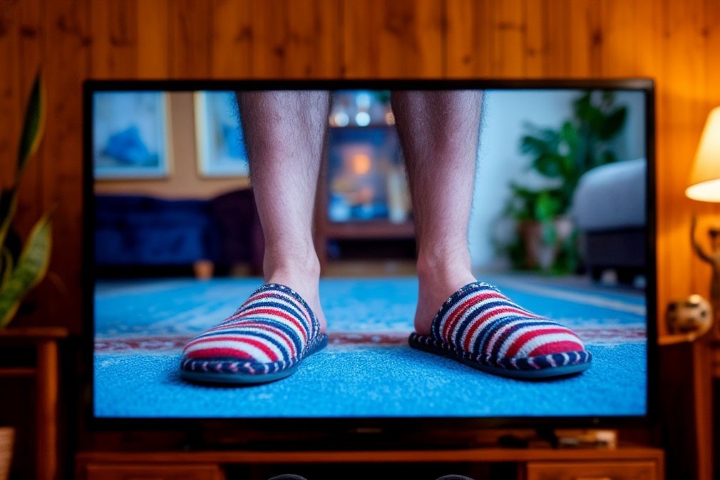На вспыхнувшем экране появились волосатые ноги в полосатых тапках.