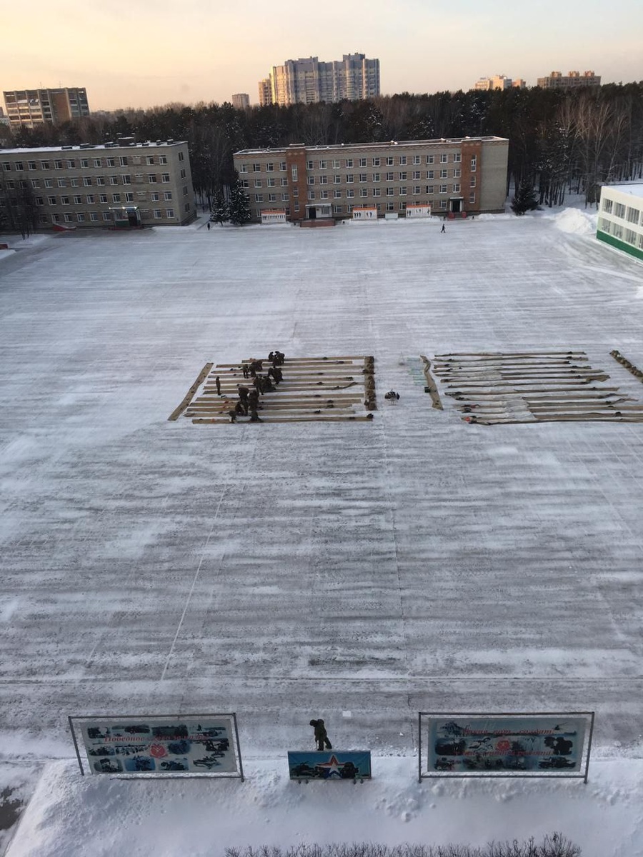 Новосибирское высшее военное командное ордена Жукова училище. Плац. Укладка парашютов курсантами факультета военной разведки. Фотография сделана из окон главного учебного корпуса. А напротив видна наша казарма, (у меня был 1 этаж). Единственная казарма, кстати, где была горячая вода и душ) То, насколько это привилегированно, когда на улице -45, это словами не передать. ... Глядя на плац, о котором ходят легенды о трёхэтажных сугробах и круглосуточной очистке, у обывателя возникнет вопрос, а где же снежные завалы, которыми славится Сибирь? Всё просто: на фото... НОЯБРЬ.