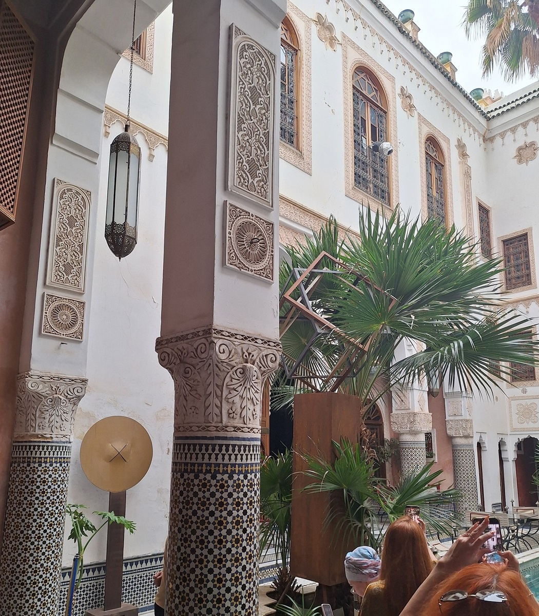 После обеда, полные новых сил и слегка отдохнувшие, мы снова вышли на улицы медины Феса, и пошли покорять новые просторы. Я не знаю, кто как относиться к сериалу «Клон». Лично мне он был фиолетово. Но на работе коллеги дамского пола прямо оживились, узнав мой маршрут. Мне была рассказана не только сериальная жизня, но и жизнь в реале. Поэтому я специально для них зашла внутрь риада, где снимали сцены «дом дядюшки Али» и улицы по которым бегала Жади. Заодно и показать, что скрывается за не сильно интересными стенами медины. А там такая вот красота с внутренним двориком. Немного об архитектуре дверей и окон. Почему выглядят так. Часто на дверях можно увидеть два кольца - звонка. Тот что наверху - это для «своих», тогда дверь может и женщина открыть. А тот что ниже - для всех. Звонок по гендерному типу. Мы же помним, что страна мусульманская все же. То, что на окнах решетки, из этой же серии. Раньше окна выходили только на внутренний двор. Но потом стали делать окна и на улицу, и вот что