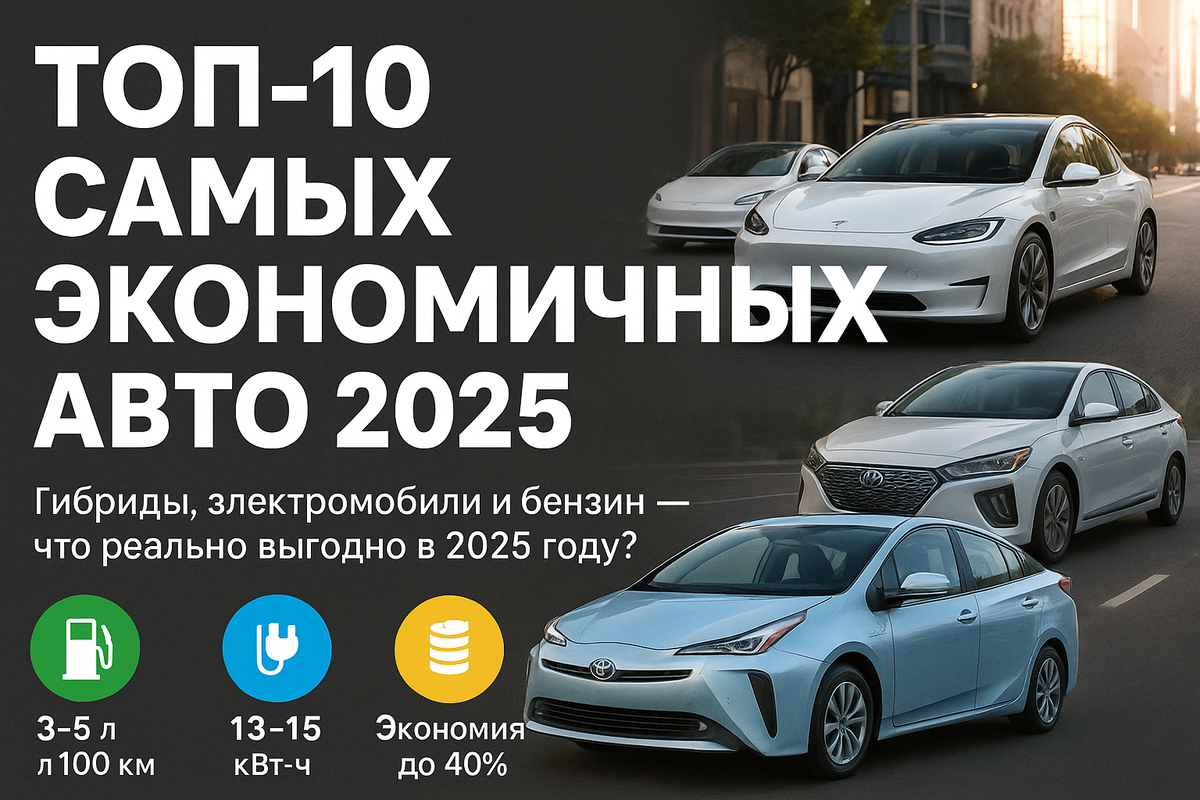 Обзор топ-моделей 2025 года по расходу топлива и энергии — бензин, гибриды и электромобили 🔥 Вступление В 2025 году экономичность автомобиля — это не только низкий расход топлива, но и общие затраты на эксплуатацию: зарядка/топливо, техобслуживание, пробег и реальная экономия денег. В этом материале собраны лучшие по экономичности автомобили 2025 года с актуальными данными по расходу (л/100 км или kВт·ч/100 км), плюс фото и практичные советы по выбору. ⸻ 🚗 Что значит «экономичный автомобиль» в 2025 году 👉 Для бензиновых и дизельных моделей — главный показатель расход топлива (л/100 км) или miles per gallon (mpg). 👉 Для гибридов — комбинированный расход топлива в смешанном цикле. 👉 Для электрокаров (EV) — энергопотребление (mpge или kВт·ч/100 км) — чем ниже, тем выгоднее эксплуатация. 👉 Также учитываем реальные условия (город/трасса), а не только паспортные значения. ⸻ 🏆 Топ-10 самых экономичных автомобилей 2025 № Модель Тип Расход/эффективность —————————————————— 1 T