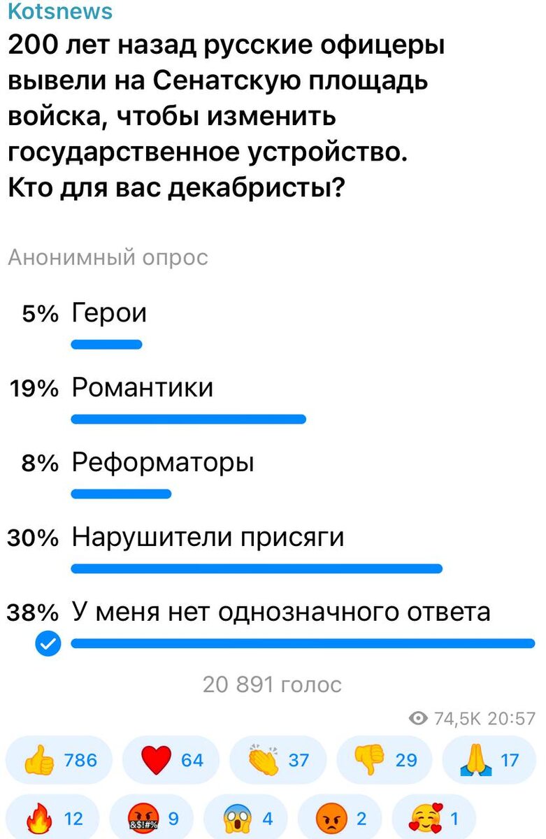⚡️⚡️⚡️ 38 процентов подписчиков не могут точно сказать, героями ли были декабристы