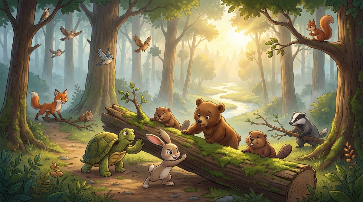 Сказка «Тропинка доверия» В одном тёплом лесу, где по утрам туман стелился, как молочное одеяло, жили звери, которые знали друг друга по именам и голосам. Но было среди них то, чего не хватало лесу больше всего, — доверия. Маленький зайчонок Шуршик был самым быстрым в округе, но и самым осторожным. Он никому не верил до конца. Если белка говорила: «Там вкусные орехи», — Шуршик думал, что его хотят обмануть. Если ёжик звал играть, зайчонок прятался за кустами. Его мама часто вздыхала: — Без доверия, сынок, даже самый быстрый бег не спасёт. Однажды в лесу случилась беда. Сильный ветер повалил старое дерево, и оно перегородило единственную тропинку к реке. Без воды лес не мог прожить долго. Звери собрались на поляне, шумели, спорили и боялись. Каждый думал только о себе. — Я не пойду первым, — сказала лиса. — А вдруг ловушка? — И я не пойду, — пробурчал барсук. — Никому нельзя верить. Тогда вперёд неожиданно вышла старая черепаха Тина. Она шла медленно, но уверенно. — Лес — как семья