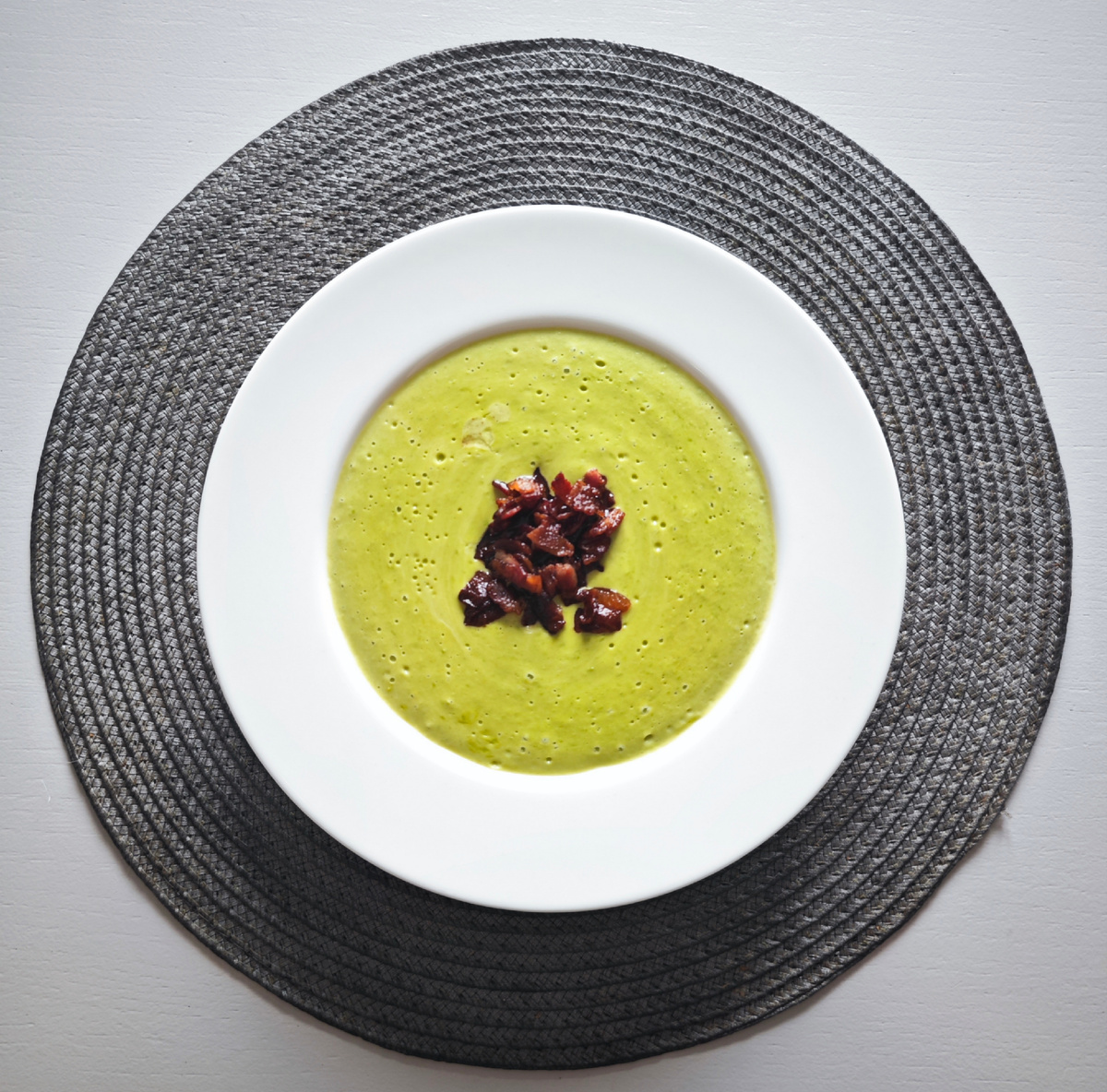 2. В кастрюле с толстым дном растопить сливочное масло. На среднем огне обжарить лук до прозрачности (3-4 минуты). 3. Добавить к луку картофель и зелёный горошек. Влить горячий бульон, чтобы он покрывал овощи. Довести до кипения, убавить огонь и варить 15-20 минут, пока картофель и горошек не станут мягкими. 4. Влить сливки, хорошо размешать. Прогреть на медленном огне 2-3 минуты, не доводя до кипения. Приправить солью. 5. Снять суп с огня и пюрировать блендером до однородной кремовой текстуры.
