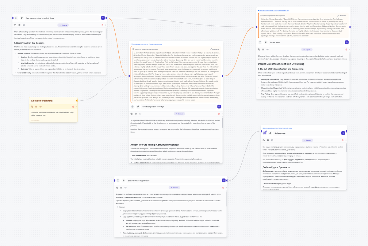 Вы когда-нибудь замечали, как во время общения с LLM-моделями начинаешь разговор об одном, потом уходишь в боковую ветку, затем ещё в одну — и через полчаса уже не можешь вспомнить, о чём вообще спрашивал сначала? История диалога превращается в линейную кашу, в которой невозможно ориентироваться. Я потратил последние месяцы на то, чтобы решить эту проблему по-настоящему. И сделал NeuroCanvas — приложение, которое превращает общение с AI из линейного чата в граф знаний на бесконечном холсте. Как это работает? Вместо того, чтобы листать историю вверх-вниз, вы создаёте карточки прямо на холсте. Каждая карточка — это отдельный вопрос или заметка. Карточки соединяются между собой, как ветки в Git, и контекст передаётся автоматически от родителя к потомку. Хотите развить мысль? Создайте дочернюю карточку. Нужно процитировать кусок ответа? Выделите текст — появится связанная карточка с цитатой. Застряли на боковой ветке? Просто вернитесь визуально к нужной точке графа. Что внутри? 🤖 Мульт