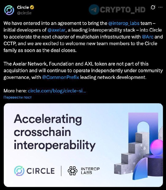 🤑 #AXL Circle объявила о покупке команды разработчиков Axelar с их интеллектуальной собственностью – анонс