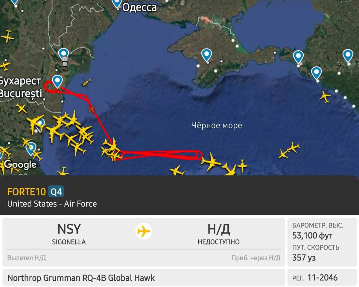 Американский стратегический разведывательный беспилотник Northrop Grumman RQ-4B Global Hawk проводит интенсивную разведку в районе Крымского полуострова. Основное внимание дрона сосредоточено на районах Севастополя, западной части Крыма, Крымского моста, а также акватории в районе Новороссийска.