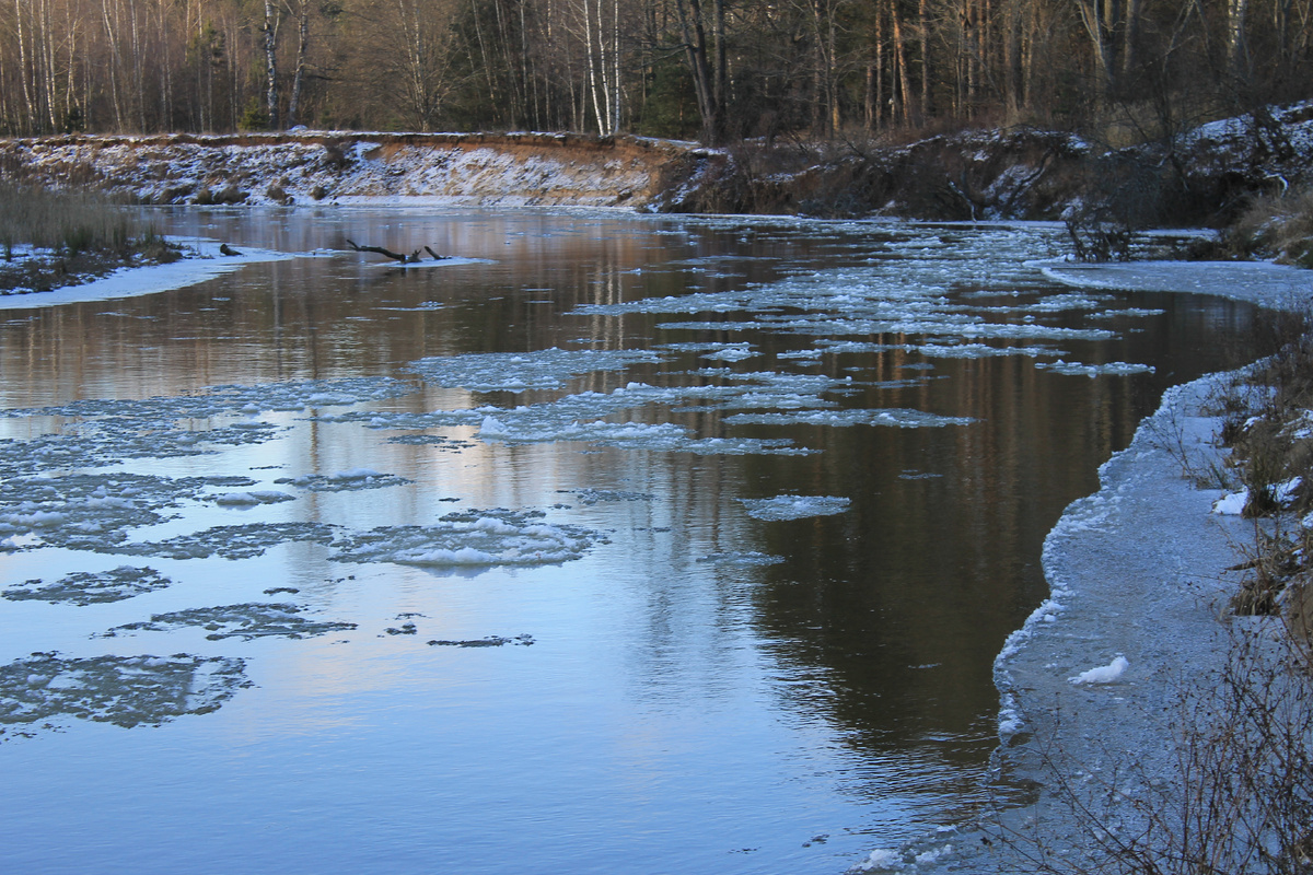 Зима в этом году задержалась до середины декабря. Задержалась , но не отменилась. По реке Киржач, в районе Городищ появился первый лёд. "Первый лёд на реке, я к тебе по нему не дойду..." строчи из одной известной песни. Действительно по такому льду далеко не дойдешь. Вдоль берега уже появляется наледь, подходить близко к воде становится опасно. Маленькие льдинки достаточно быстро влекутся течением, постепенно сбиваясь в большие ледяные поля Снега практически нет, мороз опускается до минус 10 градусов, погода для прогулок очень даже замечательна. Всё русло постепенно захватывают ледяные захватчики, день, другой и река встанет. Солнце в середине декабря висит низко над горизонтом, что позволяет делать такие снимки, упавшие лучи в ледяной воде. Природа великолепный художник, здесь мы видим как она начинает писать первые зимние картины.