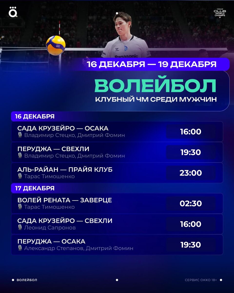 Завтра стартует клубный ЧМ по волейболу среди мужчин. Делимся расписанием группового этапа 🏐