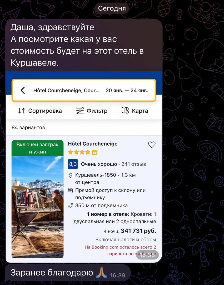 Один из запросов сегодня. Наша цена в этот отель, на эти же даты, завтраки и ужины — 310 тыс рублей ! Не всегда бывает так, что цены booking у нас ниже, но в 80% случаев, контрактные цены с отелями у наших партнеров ниже + возможность оплаты рублями 🌞 Пишите, посчитаем @life_travel_agent