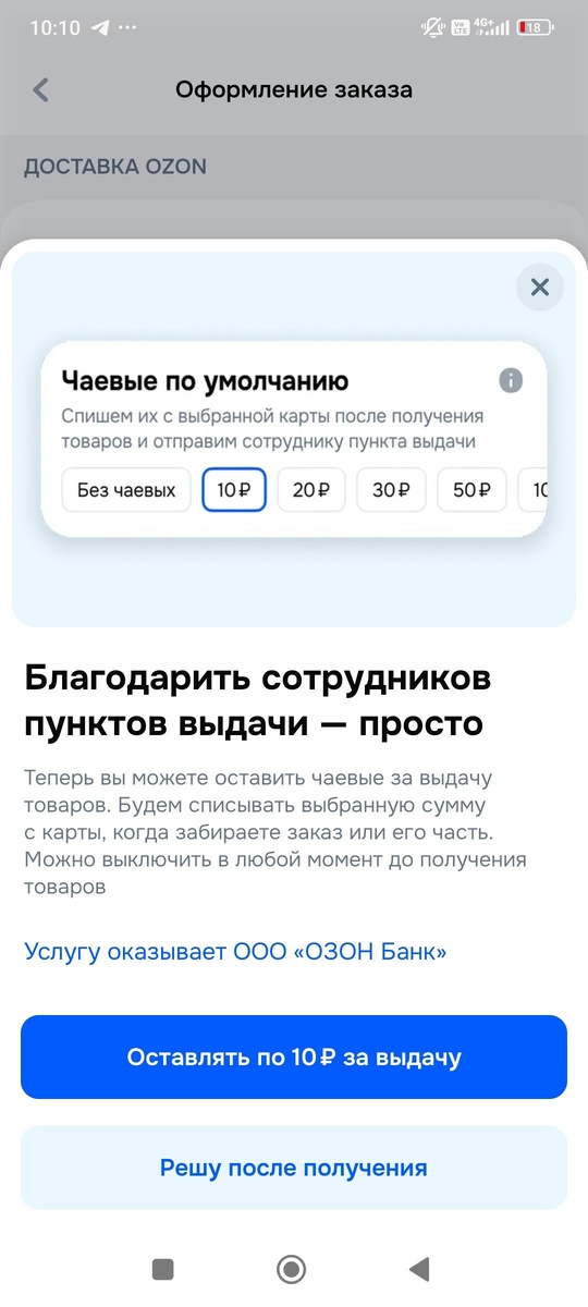 На Озоне при заказе теперь есть пункт чаевые сотруднику💵