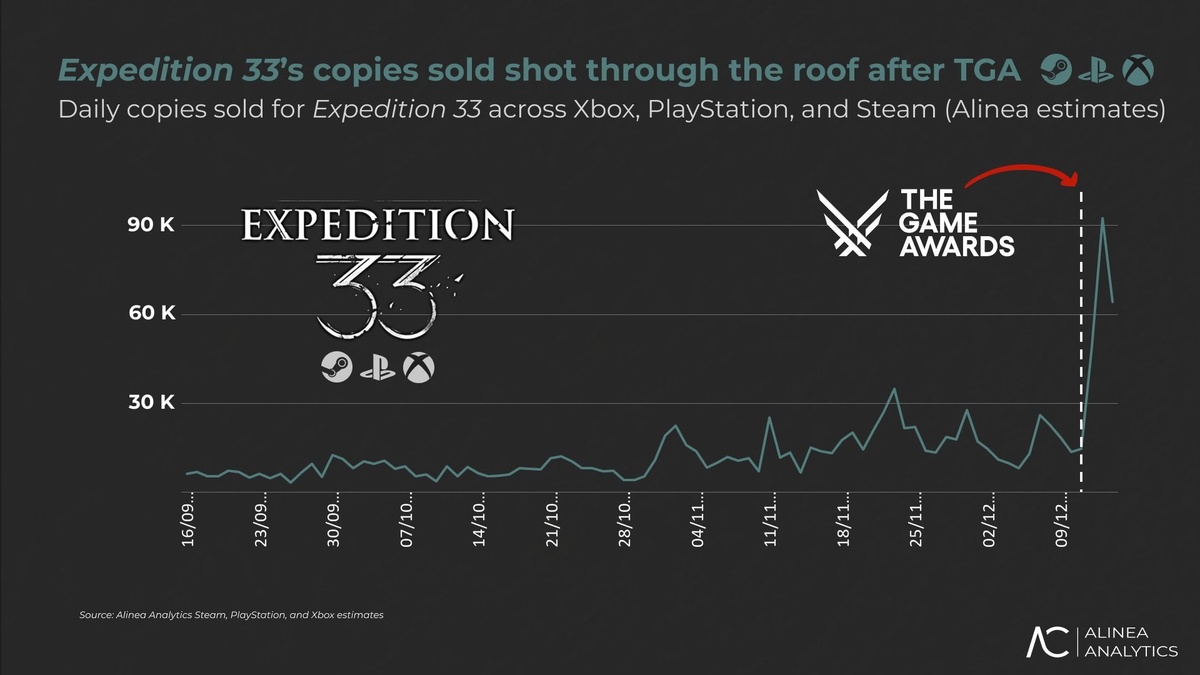 Продажи Clair Obscur: Expedition 33 скакнули после The Game Awards. Было продано более 200 000 копий игры: 76% в Steam, 21% на PS5 и 3% на Xbox. Кроме того, около 52 000 игроков на Xbox впервые запрыгнули в 33 через Game Pass.