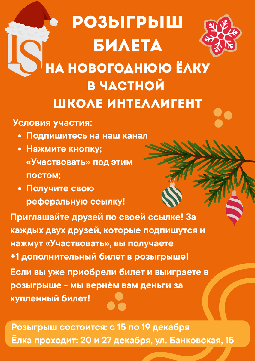 🎁 Приз - 1 билет на Новогоднюю Ёлку в Частной Школе ИНТЕЛЛИГЕНТ 20 или 27 декабря! 🚀 Увеличивайте шансы! Приглашайте друзей по своей ссылке! За каждых двух друзей, которые подпишутся и нажмут «Участвовать», вы получаете +1 дополнительный билет в розыгрыше! ❗️ Важно для тех, кто уже купил билеты: Если вы уже приобрели билет и выиграете в розыгрыше - мы вернём вам деньги за купленный билет! 📅 Розыгрыш состоится: с 15 по 19 декабря! 🎄Ёлка проходит: 20 и 27 декабря, ул. Банковская, 15. 📞 Наш телефон: +79660886777 🔗 Яндекс-форма для записи на Ноговоднюю Елку: https://forms.yandex.ru/cloud/693fcf1bd046885e9446f142/