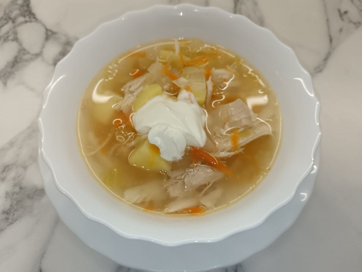 Всем привет! Сегодня готовлю супчик, да супчик не простой, с квашеной капустой! Я если честно вообще люблю супы с кислинкой, поэтому эта замечательная капуста тут прямо в тему. Еще один плюс, что этот суп готовится сравнительно легко и быстрее, чем многие другие супы. 1. Варим бульон на курице (мне нравится брать бёдра). Бульон после закипания варю не меньше часа. После закипания воды бульон необходимо посолить. Когда бульон сварится курицу достаём, даём ей остыть, разделываем на кусочки. Которые потом нужно добавить обратно в суп. Куриный бульон 2. Картошку чистим, нарезаем кубиком и добавляем в бульон. 3. Далее чистим лук, режем кубиком и после того как бульон с картошкой закипит, добавляем в суп. Кстати зажарку я не делала и это тоже экономит время. 4. Морковью чистим, трем на крупной терке и добавляем также после закипания. 5. Остался последний и главный штрих - квашеная капуста. Добавляем её минут через 15. Добавьте лавровый лист и перец горошком по вкусу и потоми