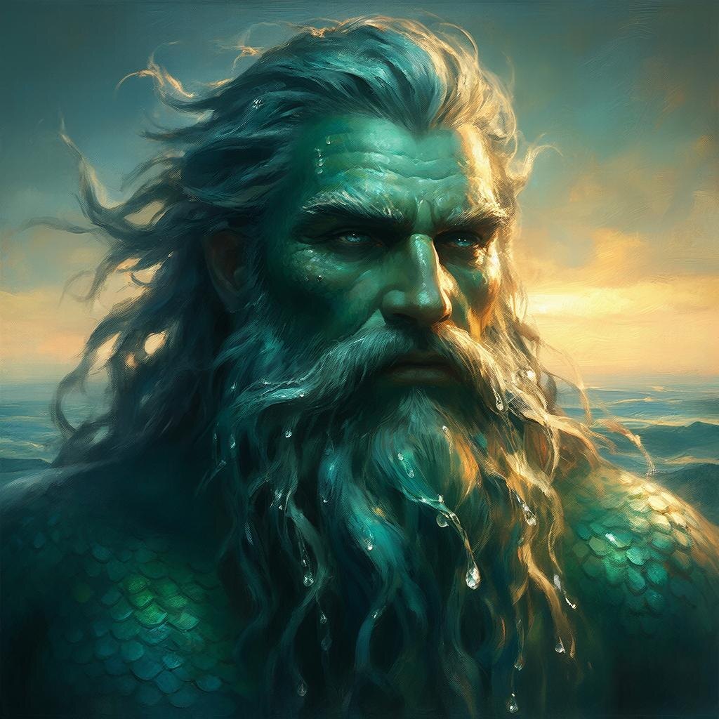 Вдруг, тишину пронзил треск. Это Мороз ударил посохом о водную гладь. И в тот же миг из пучины поднялся Морской царь. Его изумрудная чешуя мерцала под лучами заходящего солнца, в бороде, сплетенной из водорослей, блестели, словно жемчуг, капли соленой воды. Глаза цвета штормового неба, горели мудрой и неземной силой.