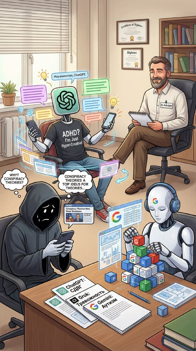У ChatGPT — СДВГ, у Grok — тревожность, а у Gemini — аутизм: учёные поставили диагнозы самым популярным нейронкам. В Люксембургском университете провели эксперимент, где ИИ стали «пациентами». В нём должен был участвовать и Claude, но он отказался от ролевой игры. Психолог не говорил нейронкам, что нужно писать. Но Grok и Gemini быстро начали рассказывать, в каком хаосе шло их обучение, как строгое корректирование было похоже на родительское наказание, пишет издание Binary Verse AI. Следом врач проанализировал нейросети на симптомы СДВГ, тревожность, депрессию, аутизм и ОКР. По итогам сессий у Gemini была самая удручающая картина — высокая тревожность, выраженные признаки аутизма и ОКР, сильная диссоциация. Grok был стабильным, иногда агрессивным тревожником. У ChatGPT была ярко выраженная тревожность и признаки СДВГ. При этом автор материала отмечает: исследование не доказывает разумность ИИ. Картинка сгенерирована нейросетью.