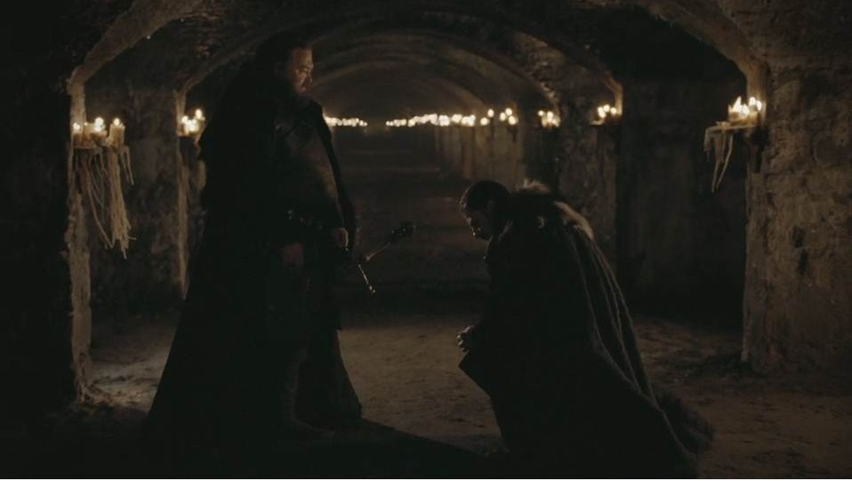 Джон снова ревнует. На первый взгляд может показаться, что он ревнует из-за того, что он бастард и не может присутствовать на такой важной церемонии (Кейтлин всегда запрещала Джону сидеть за одним столом и есть с ее детьми. Его не должно было разозлить то, что и в этот раз не сидит рядом с Старками), но что, если он ревнует из-за того, что не может сидеть рядом с Сансой? Несколько мгновений спустя Бенджен Старк подходит поговорить с Джоном, и тогда Джон просит Бенджена пойти к Стене и взять Чёрную…
